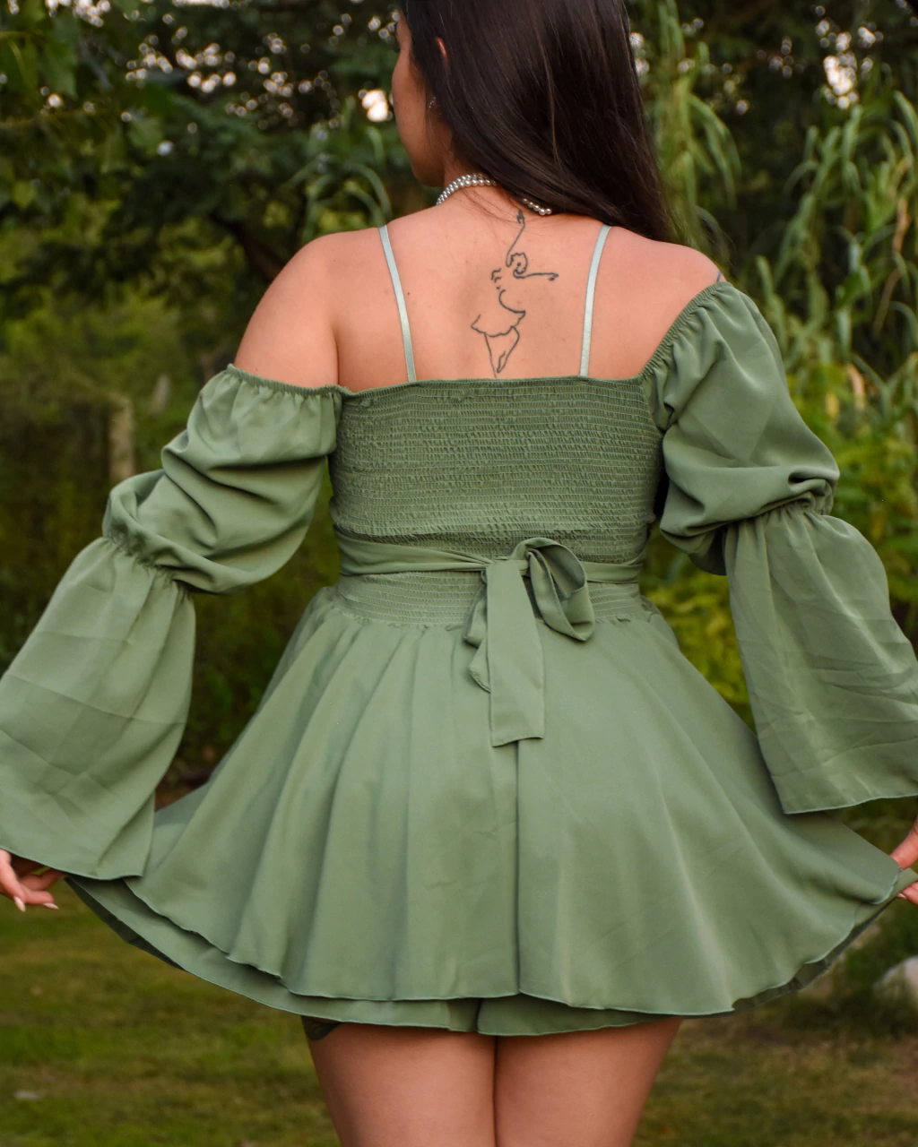 Vestido corto con escote corazón y breteles finos regulables. Mangas largas caídas tipo off-shoulder. Cintura con ajuste tipo corset que marca la silueta. Falda amplia con doble capa y short oculto integrado. Espalda con elástico y lazo regulable.